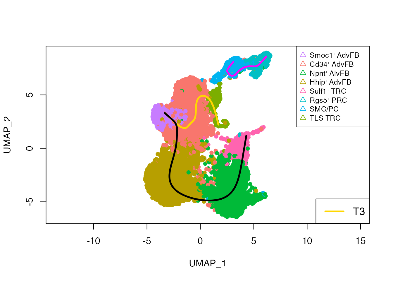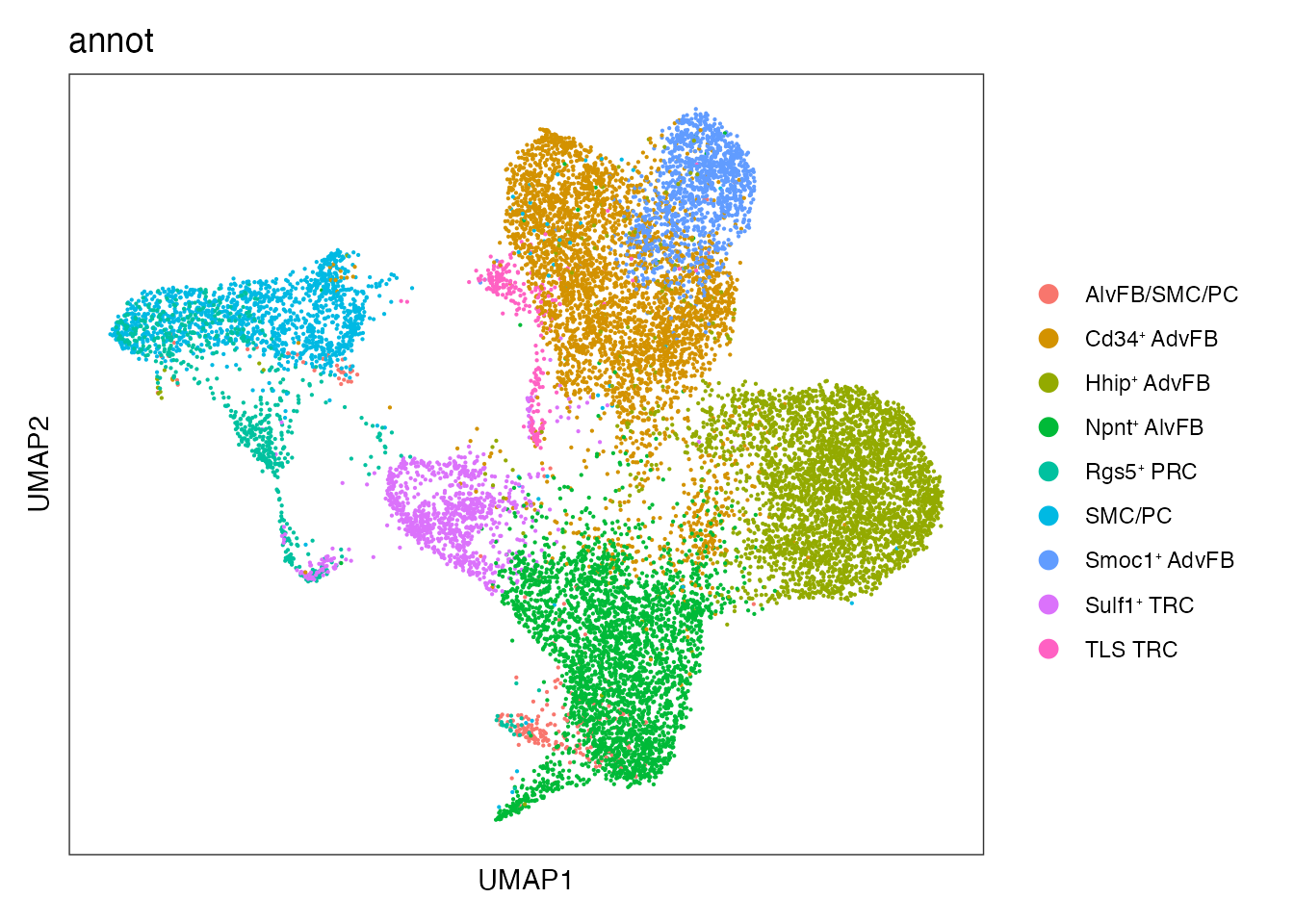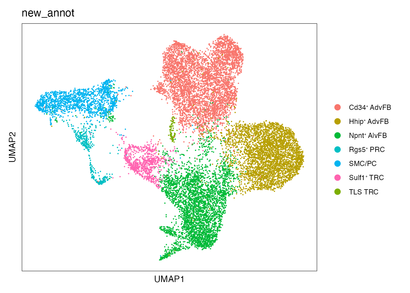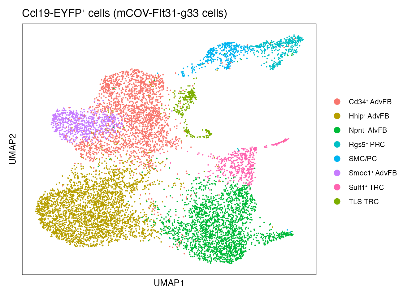 names(cols) <-c(paste0("Smoc1", expression("\u207A "), "AdvFB"),paste0("Cd34", expression("\u207A "), "AdvFB"),paste0("Npnt", expression("\u207A "), "AlvFB"),paste0("Hhip", expression("\u207A "), "AdvFB"),paste0("Sulf1", expression("\u207A "), "TRC"),paste0("Rgs5", expression("\u207A "), "PRC"),"SMC/PC","TLS TRC")