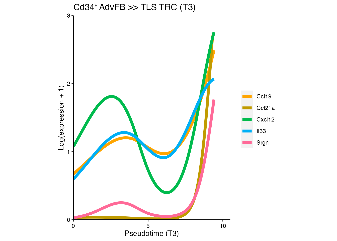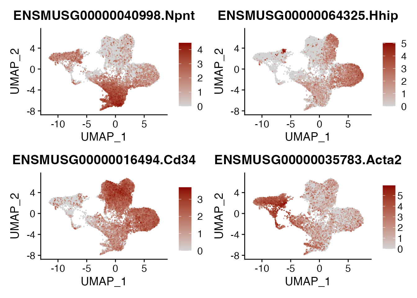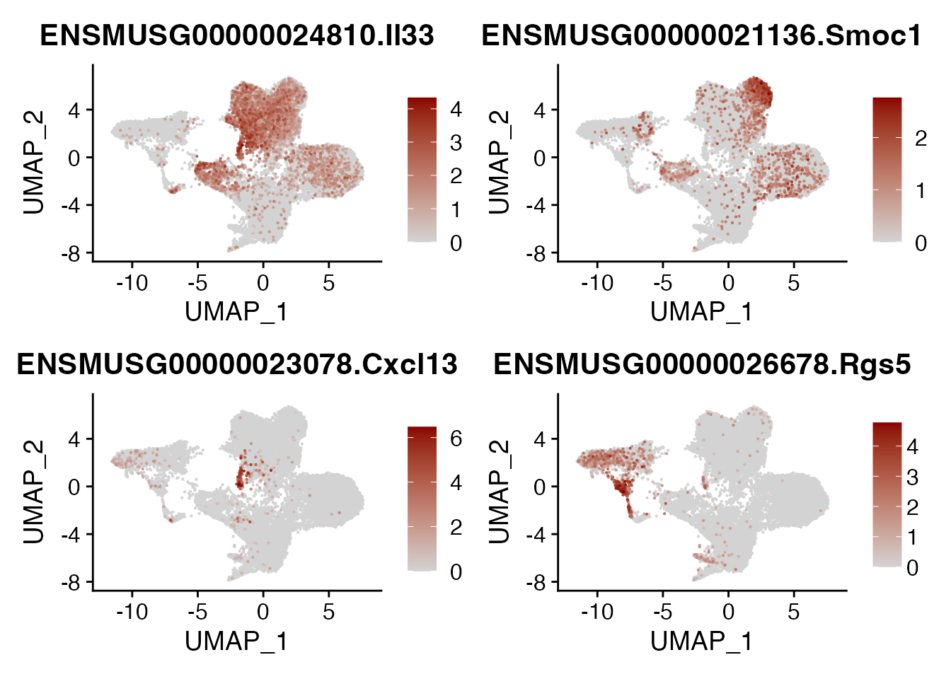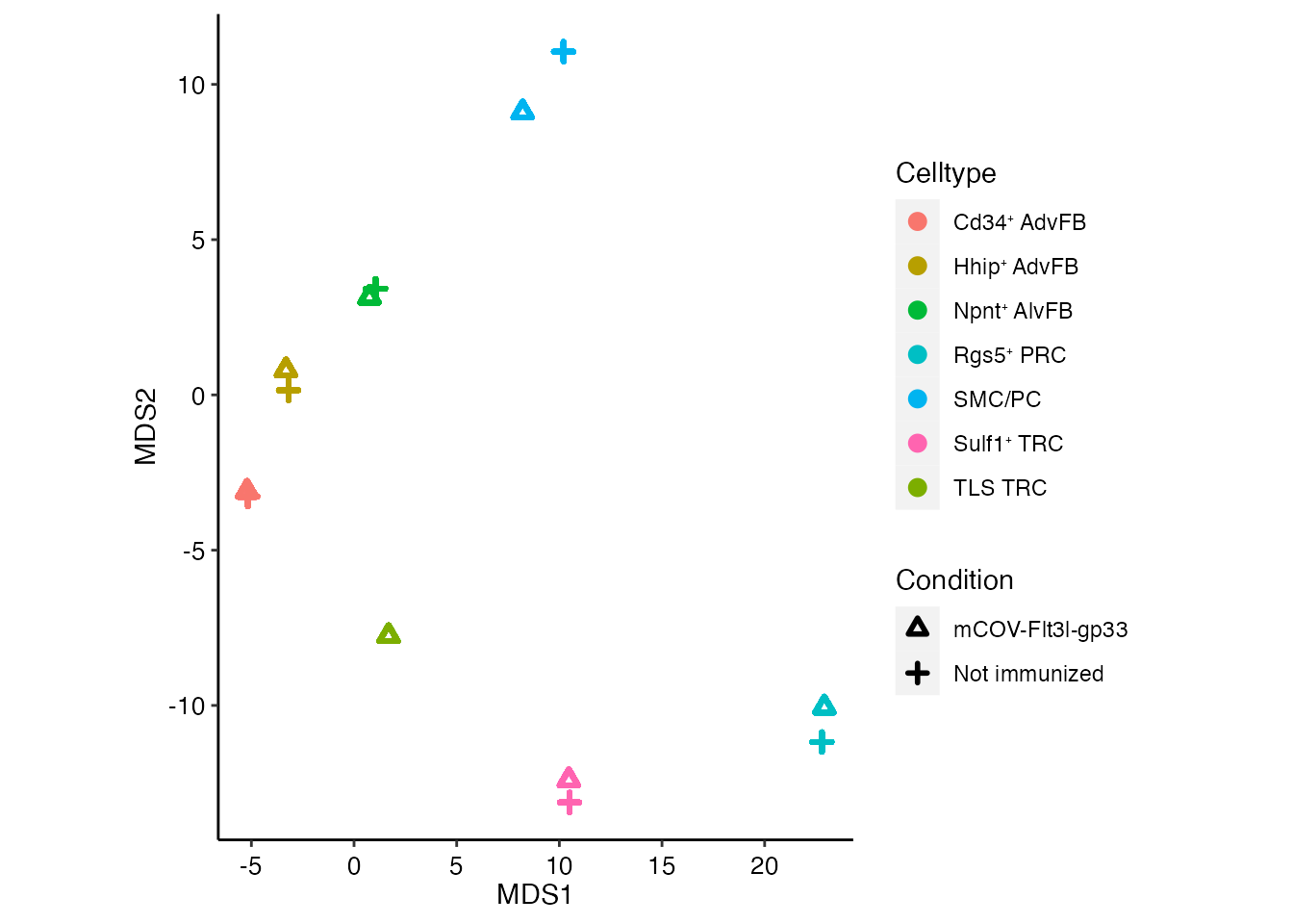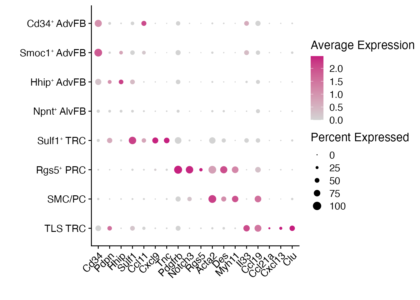 names(cols) <-c(paste0("Smoc1", expression("\u207A "), "AdvFB"),paste0("Cd34", expression("\u207A "), "AdvFB"),paste0("Npnt", expression("\u207A "), "AlvFB"),paste0("Hhip", expression("\u207A "), "AdvFB"),paste0("Sulf1", expression("\u207A "), "TRC"),paste0("Rgs5", expression("\u207A "), "PRC"),"SMC/PC","TLS TRC")