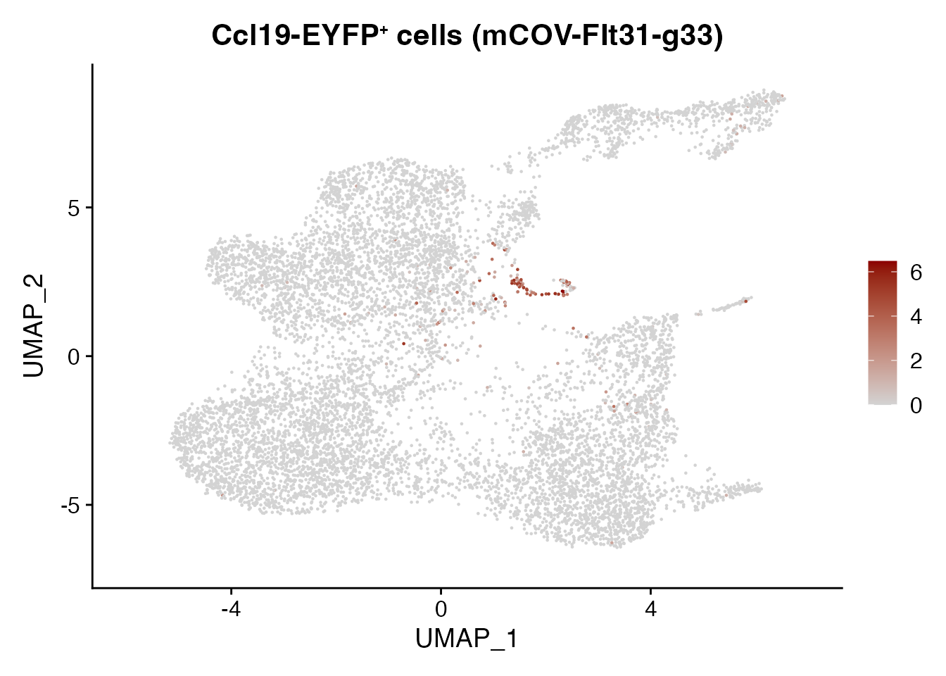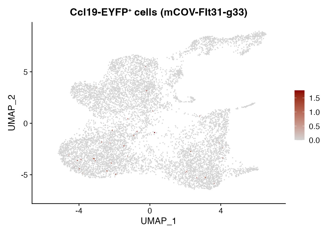 cols=c("lightgrey", "darkred")) + ggtitle(paste0("Ccl19-EYFP", "\U207A ", "cells (mCOV-FIt31-g33)"))