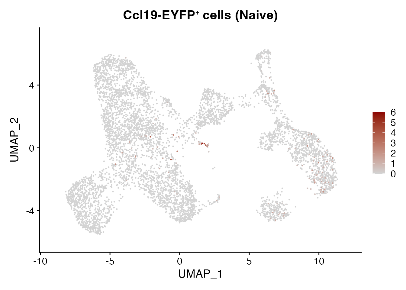 cols=c("lightgrey", "darkred"),min.cutoff = 0, max.cutoff = 6) + ggtitle(paste0("Ccl19-EYFP", "\U207A ", "cells (Naive)"))