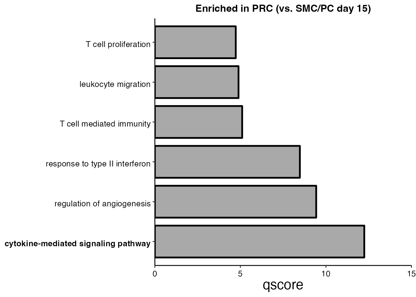 scale_fill_manual(values = "dark gray") + ggtitle("Enriched in PRC (vs. SMC/PC day 15)")